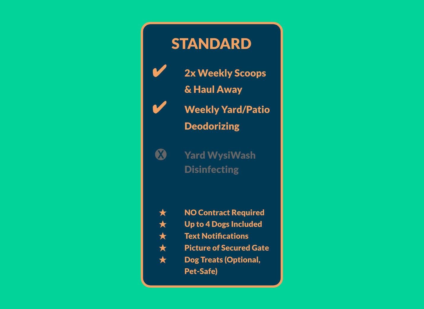 | it's simple! you sign up for a service schedule, and we visit your property to cleanup and haul away the dog waste. After each visit you'll receive a notification once job is completed. | Our services range from one-time cleanups, weekly, bi-weekly, and multi-weekly cleanups assuring your yard is pet waste free. Let us know your preferred service schedule! | No Contracts! we don't require you to sign a contract for service. our flexible service options allow you to adjust service as needed. | Rain or shine we service on the designated schedule. in the event of inclement weather (e.g., storms, heavy rain or extreme temperatures), we may reschedule your service and notify you in advance. |